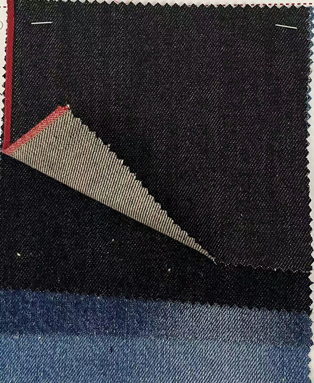 2.Custom/Newly Produce raw selvedge denim:Normally newly produce or custom order is required 3000yards,while WingFly offers some black selvedge denim and indigo selvedge denim in small minimum order quantity to custom,for the one Warp Yarn Red Core Selvedge Denim 800yards+ is ok to produce,and so on some other raw indigo denim 2000yards ok newly produce,for example 25 oz denim jeans material